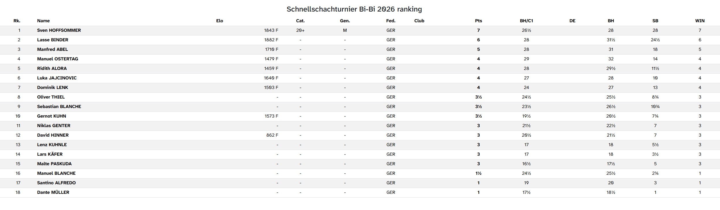 Das Schnellschachturnier war rundum ein voller Erfolg. Insgesamt 18 Teilnehmer gingen an den Start – die Spielstärke war dabei bunt gemischt, vom ambitionierten Einsteiger bis hin zu erfahrenen Vereinsspielern.